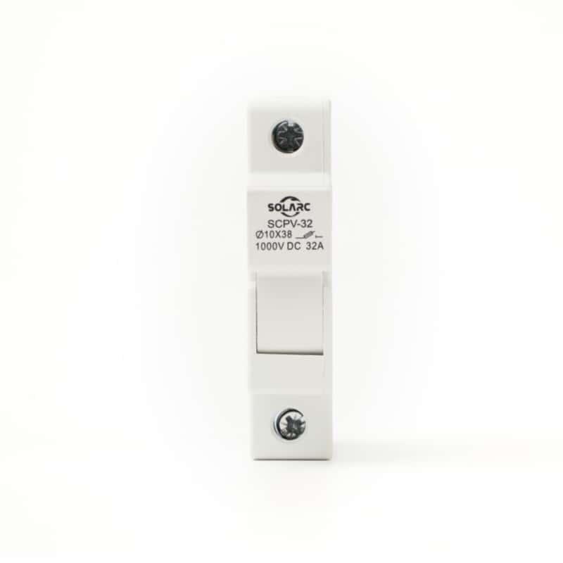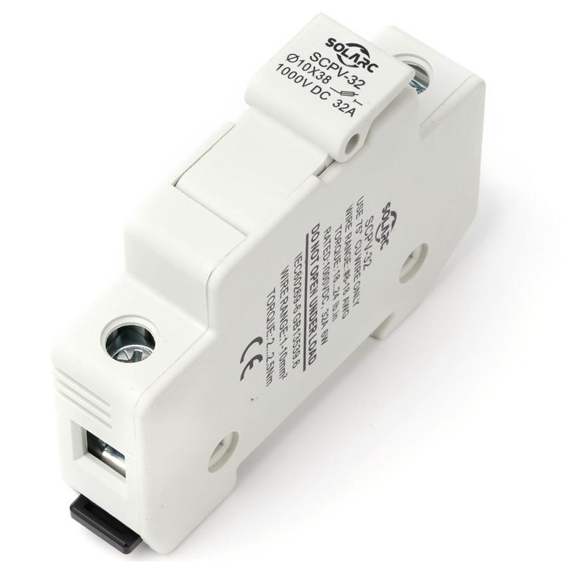 The SCPV-32 fuse base features a narrower installation width, effectively saving space in combiner boxes. The design includes ventilation slots on both sides, which effectively control the temperature rise when products are installed side by side. The flame-retardant plastic housing ensures enhanced safety. This product is primarily designed for use with the SCPV1038 photovoltaic DC fuse. It is applied in DC combiner boxes, string inverters in the photovoltaic industry, and converters in the energy storage industry, to protect and isolate photovoltaic modules or arrays, as well as chemical (storage) batteries.