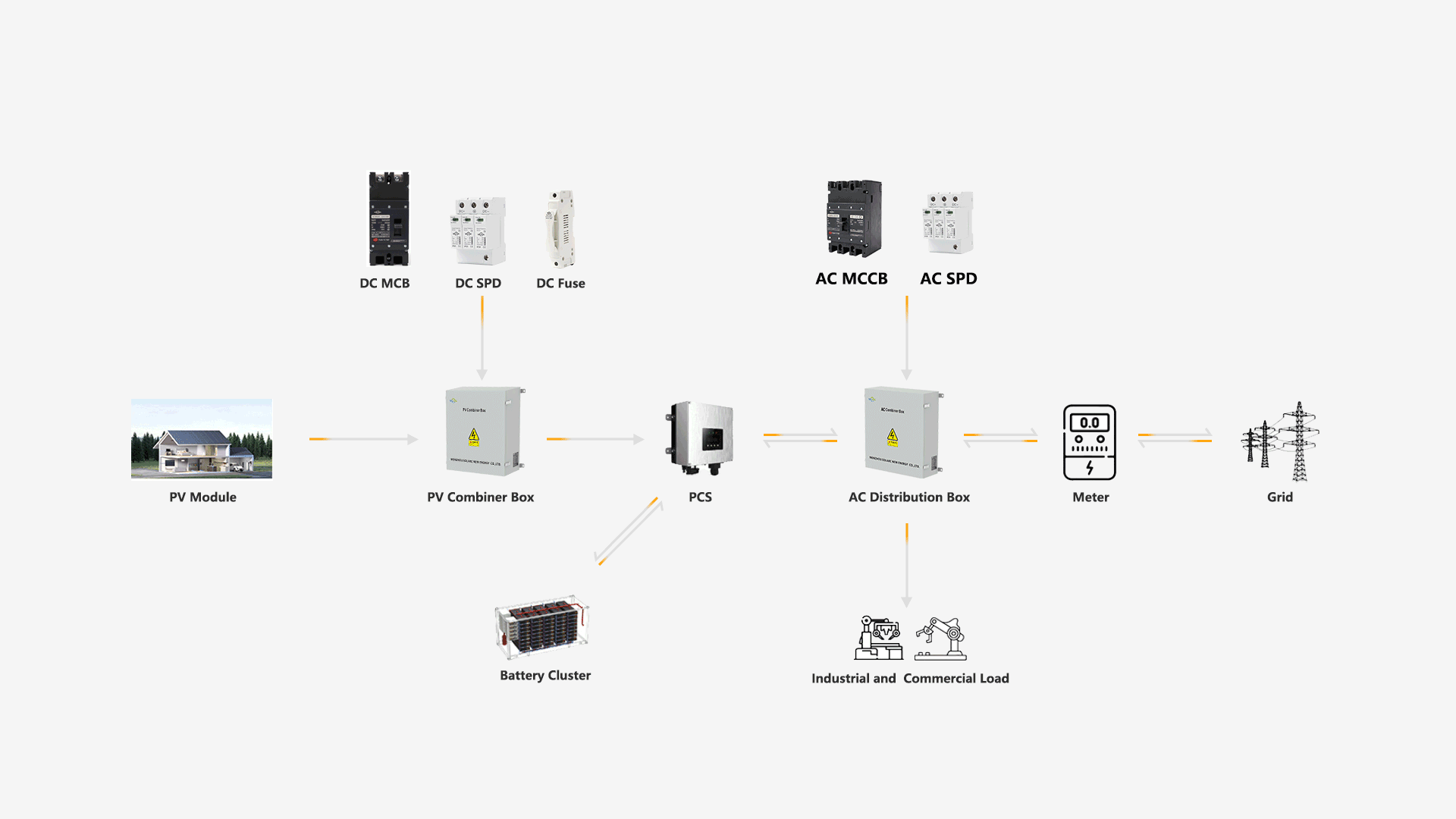 Photovoltaic combiner box: Adopting combiner boxes SCP-8 and SCP-12 with 8 or 12 inputs to improve system combiner efficiency.