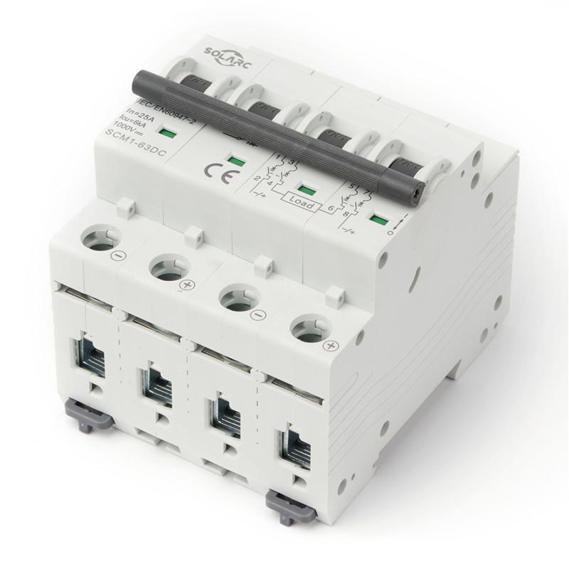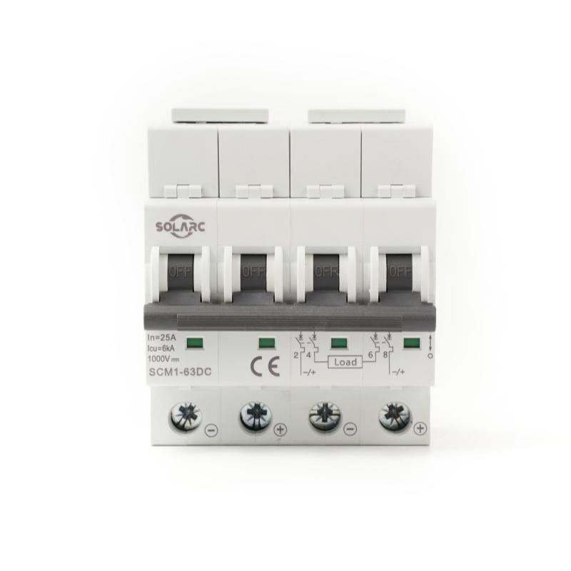 The SCM1-63DC photovoltaic DC miniature circuit breaker is a specialized protective device designed for solar photovoltaic (PV) power generation systems. It is rated for operation up to DC 1000V and 63A, primarily used for overload and short-circuit protection on the DC side of the system. This circuit breaker is widely applied in PV combiner boxes, the DC input side of inverters, and the input and output sides of DC power supply systems, ensuring the stable operation of PV systems under various environmental conditions.